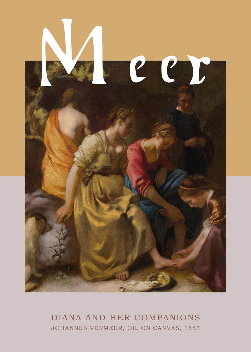 Fængslende museumsplakat med maleri af den store hollandske barokkunstner Johannes Vermeer. Værket der er tale om er Vermeers “Diana and Her Companions”, som han malede i 1653. Værket forestiller de