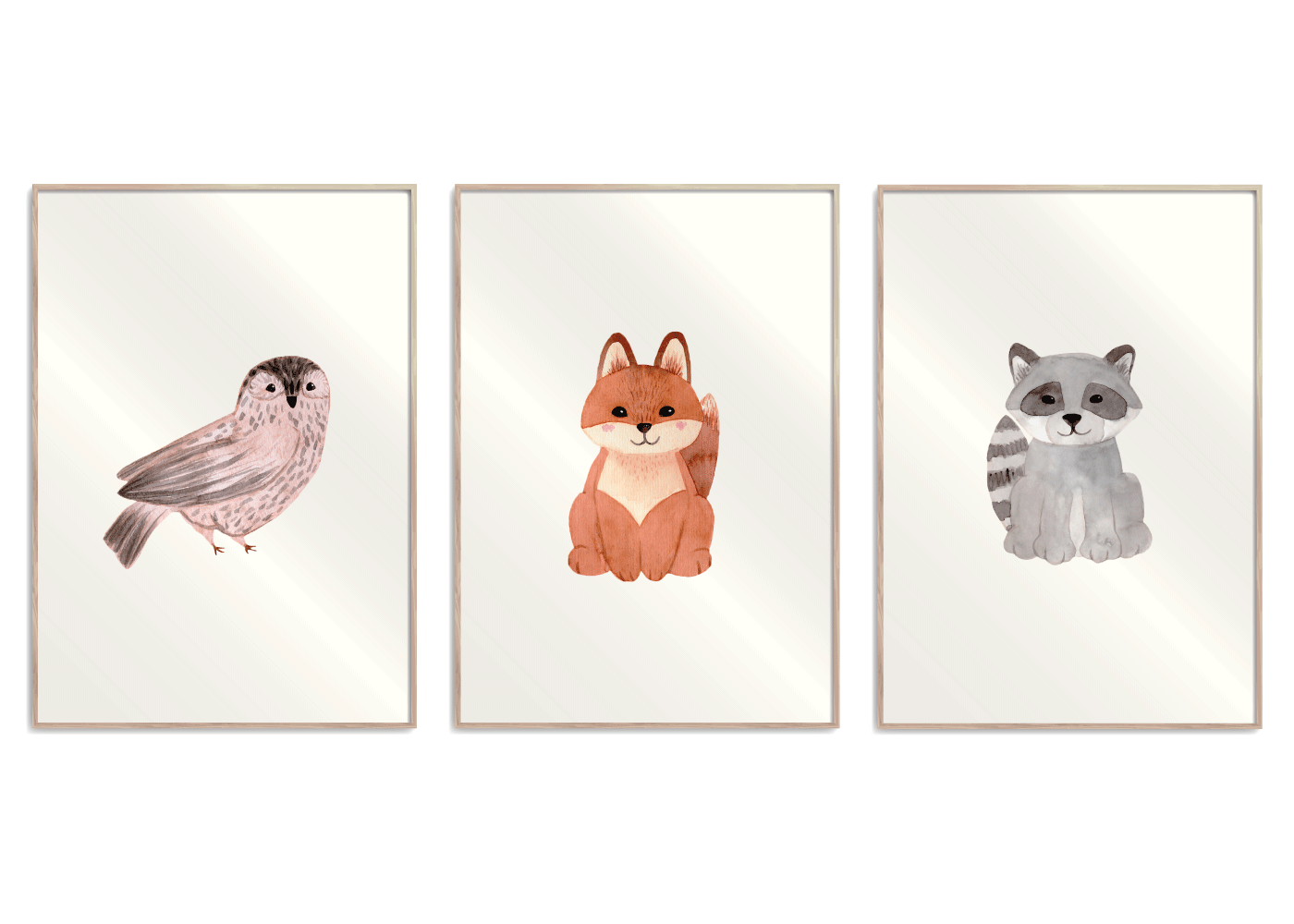 Kreer en smuk billedvæg på børneværelset med denne fine 3 i 1 plakat, der illustrerer en orange brun ræv, en sød lille ugle og en grå vaskebjørn! Med de smukke matte nuancer passer dette plakat sæt godt ind i det skandin