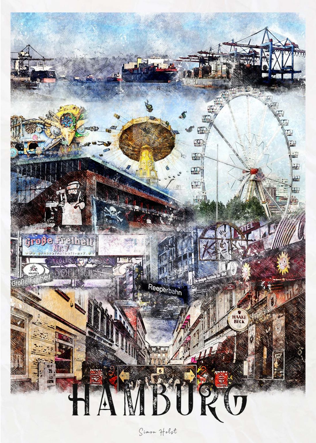 Findes der noget bedre end Hamburg? Har du også en kærlighed for Hamburg, så er dette plakaten der passer perfekt ind i netop dit hjem. Plakaten viser nogle af varemærkerne, der er med til at gøre byen helt unik. Byplakaten er lavet a