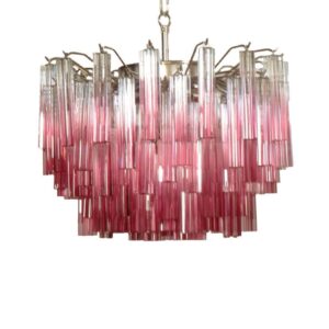 Få en smak av äkta italienskt hantverk med vår fantastiska Murano-ljuskrona. Denna skönhet är handgjord av 107 rosa Murano-prismor, var och en omsorgsfullt inramad i metall.Med sin eleganta design och raffinerade finish ger denna ljuskrona stämningsfull b