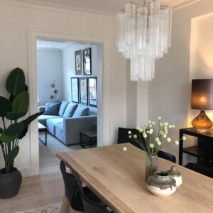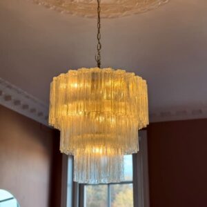 Forkæl dit hjem med den udsøgte skønhed af denne elegante italienske lysekrone, der er håndlavet af 52 fortryllende røgfarvet Murano glastuber i en strålende stjerneform. Denne betagende lysekrone vil ikke kun tilføre en sofistikeret atmosfære til dit spi