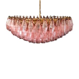 Forkæl dit hjem med en strålende elegance med vores italienske lysekrone, der er en sand perle af skønhed og håndværk. Denne luksuriøse lysekrone er fremstillet af 84 fortryllende klare og blå Murano-glas âpoliedriâ, der fanger lyset på en forbløffend