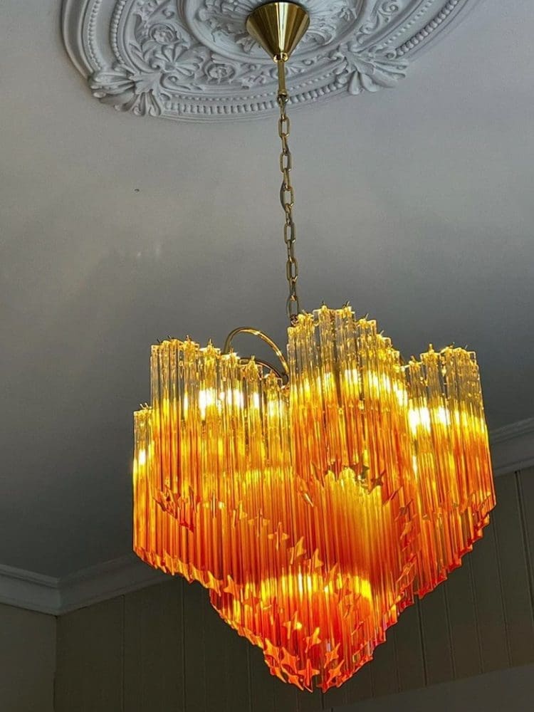 Lad din personlige stil skinne igennem med vores storslåede Murano lysekrone, der bringer en aura af elegance ind i ethvert rum. Denne enestående lysekrone er formet som en spiral og er prydet med 114 rav farvet fadet Quadriedri prismer, der fanger lyset