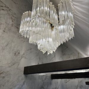 Lad din personlige stil skinne igennem med vores storslåede Murano lysekrone, der bringer en aura af elegance ind i ethvert rum. Denne enestående lysekrone er formet som en spiral og er prydet med 114 klare Quadriedri prismer, der fanger lyset på fortryll