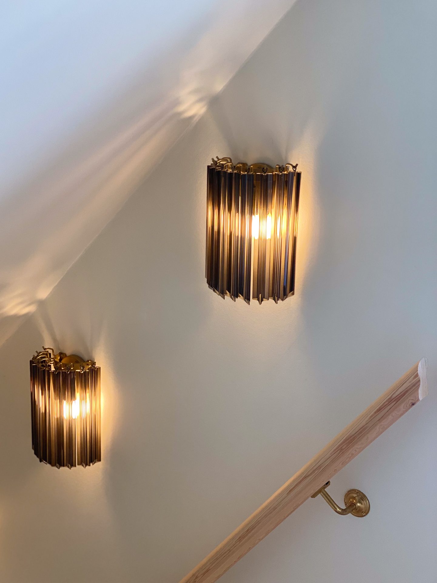 Farve: Røgfarvet Dimensioner: 30 cm i højden, 22 cm maksimal bredde, 12 cm i dybden fra væggen. Dimension glas: 28 cm i  højden. Pærer: 1 pære E14-dimension for hver enkelt (ikke medtaget i dette salg) Virker desuden til lysdæmper. Antal: Sælges enkeltvi