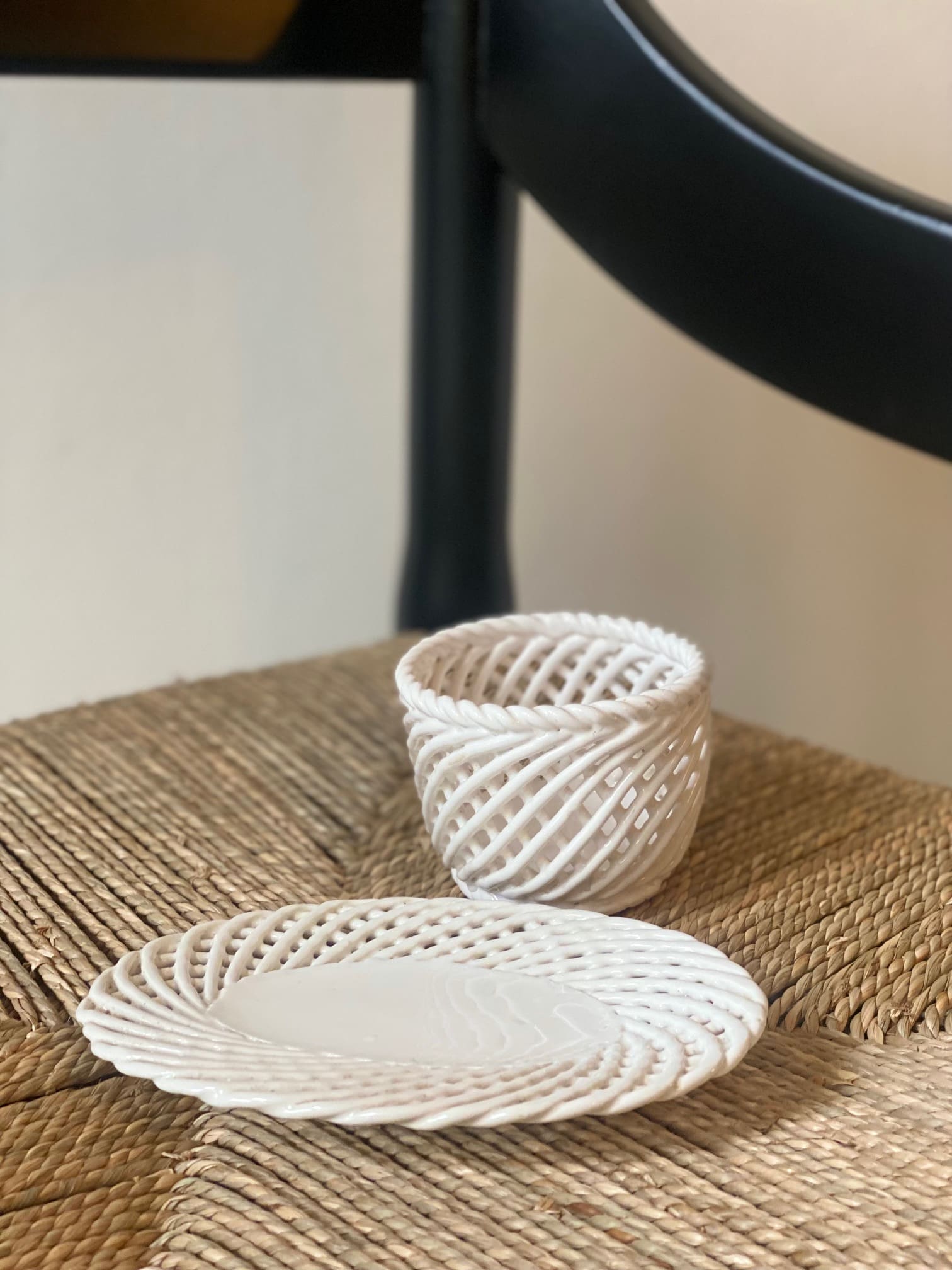 Flet skål:Højde: 7 cmDiameter: 9 cmStand: Super fin stand, ingen afslag.Vægt: 130 gram.Flet fad:Længde: 17 cmDiameter: 12 cmVægt: 130 gram.